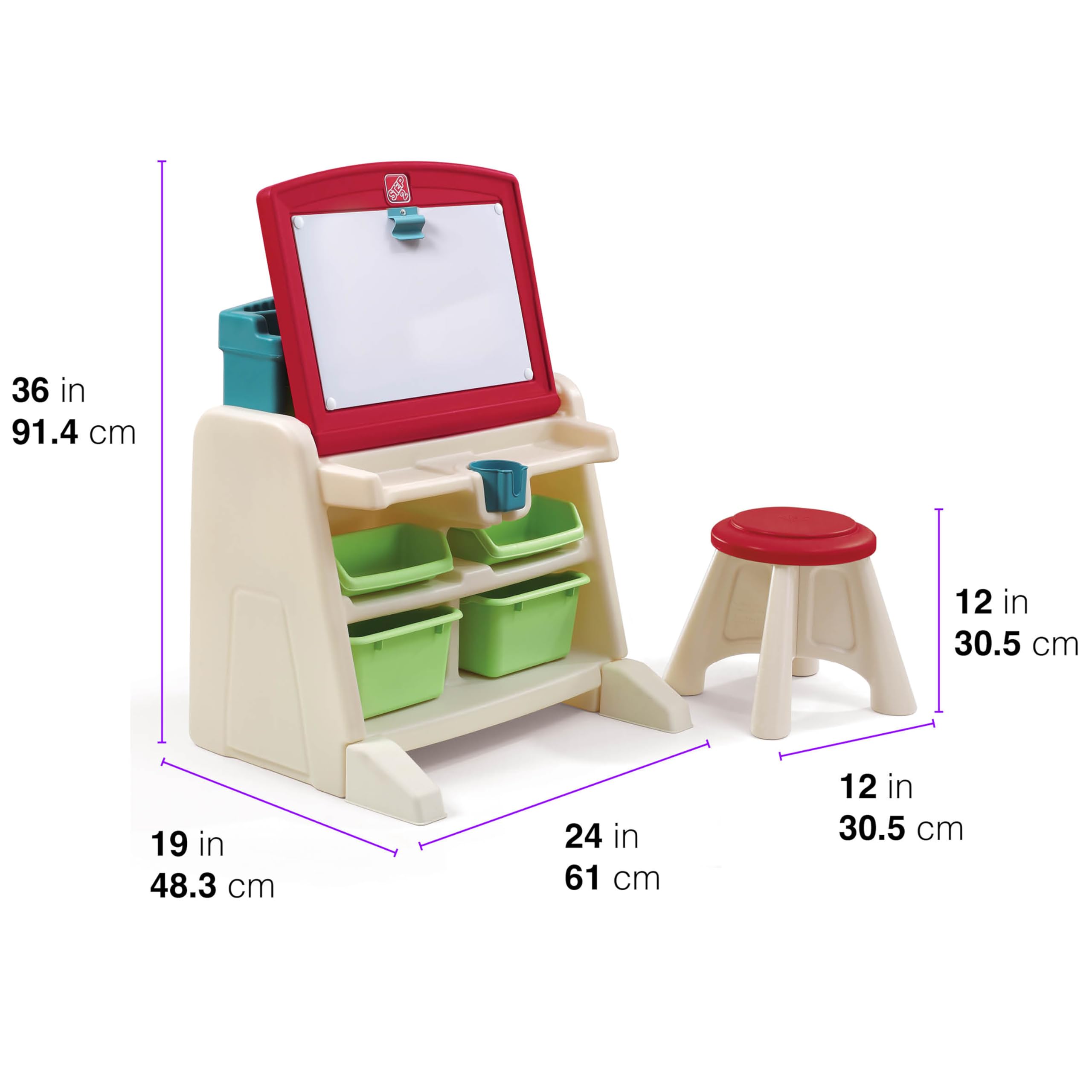 - STORE & ORGANIZE: Trays and cup holder for markers and pencils, comfortable stool, max stool weight: 75 lbs., height: 11.75 in, back storage for books, four bins to hold art supplies, dimensions 26" H x 23.75" W x 19" D