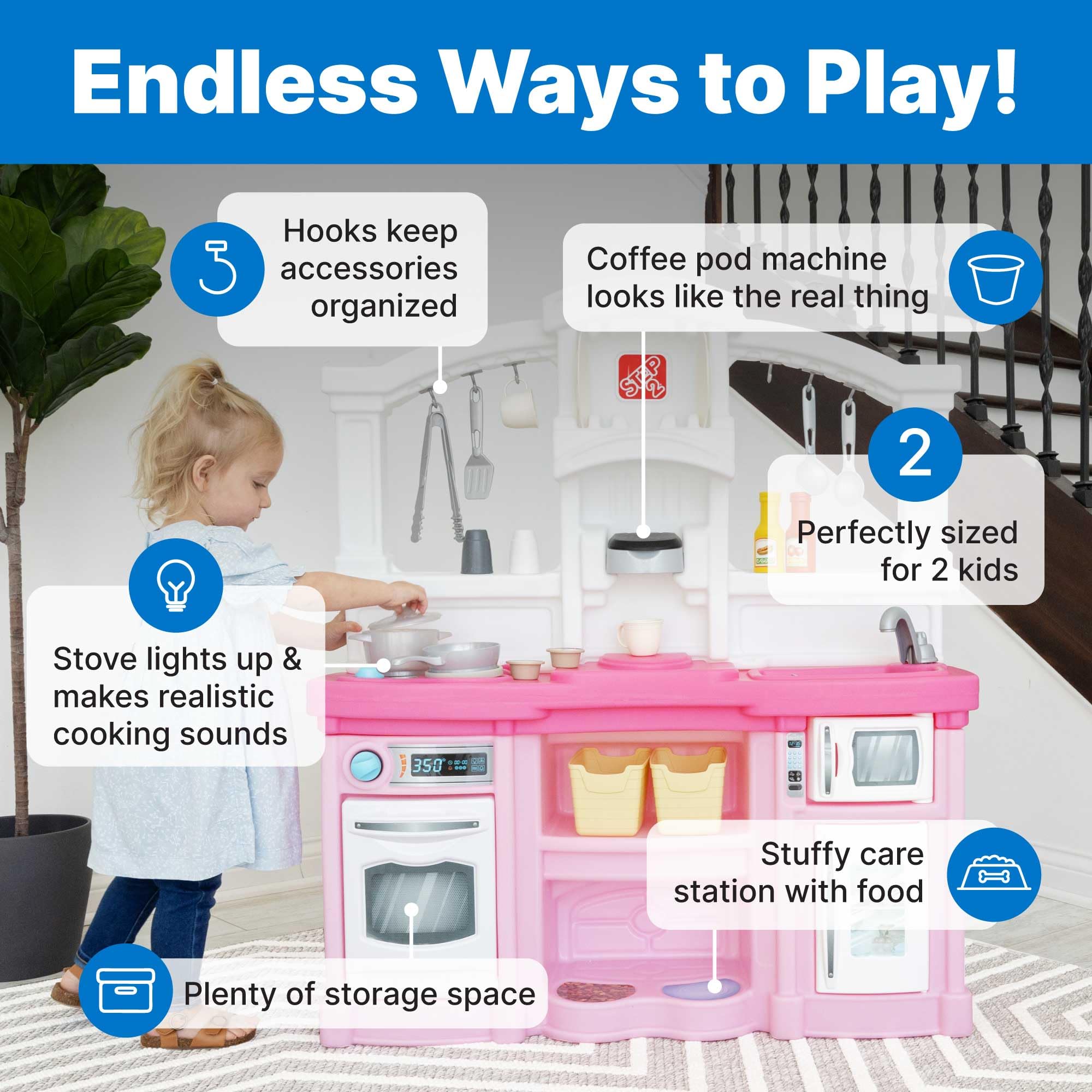 Step2 Fun with Friends Kids Kitchen Playset, Indoor/Outdoor Kitchenette, Interactive Play with Lights and Sounds, Durable Plastic, Includes 25 Piece Toy Accessories, Toddlers 2+ Years Old, Pink
