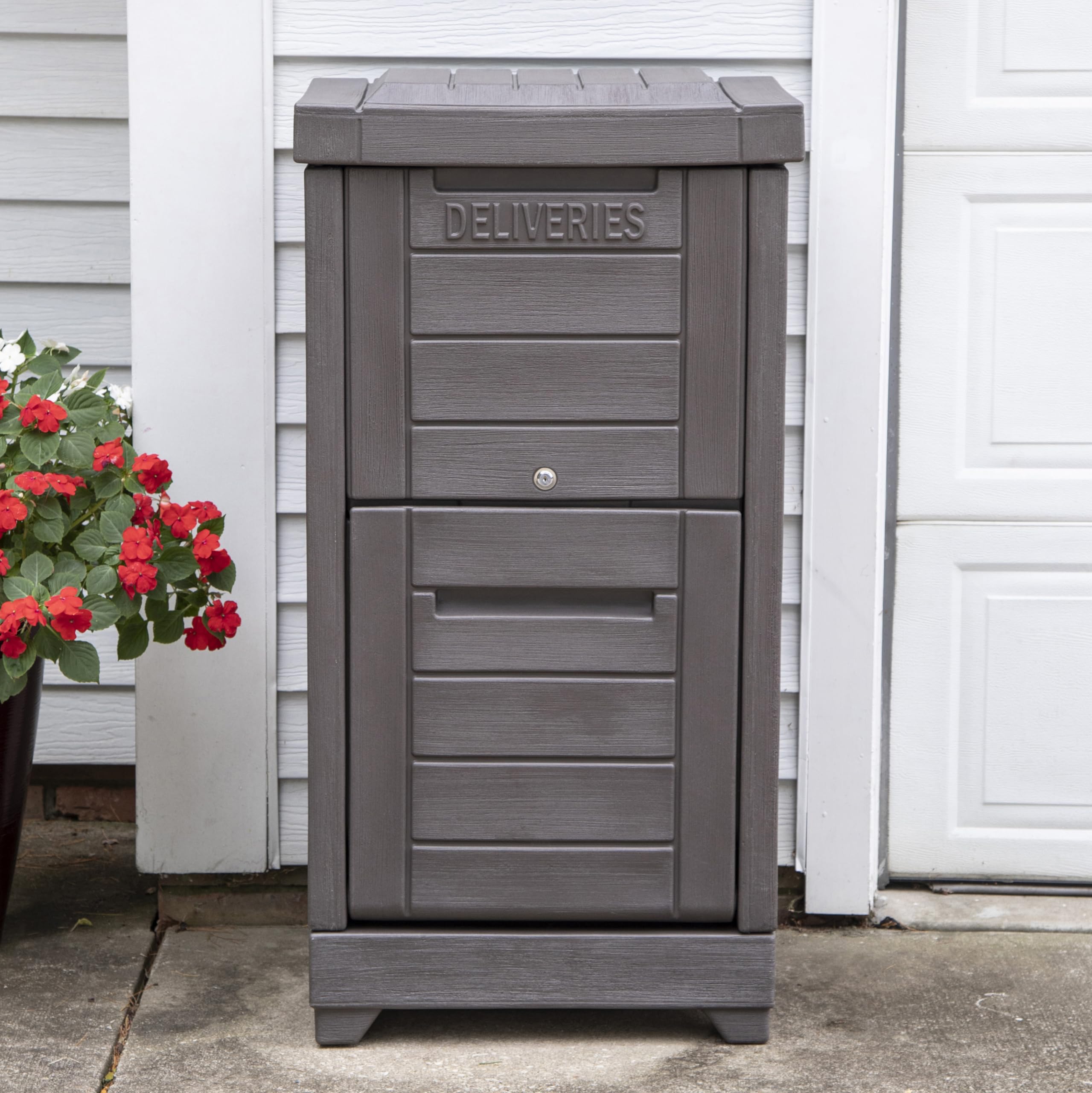 - EASY TO ASSEMBLE: Includes base, lid, lock & 2 keys, package delivery sign with double-sided tape, and assembly hardware, assembled dimensions 49" H x 25.25" W x 19.9" D