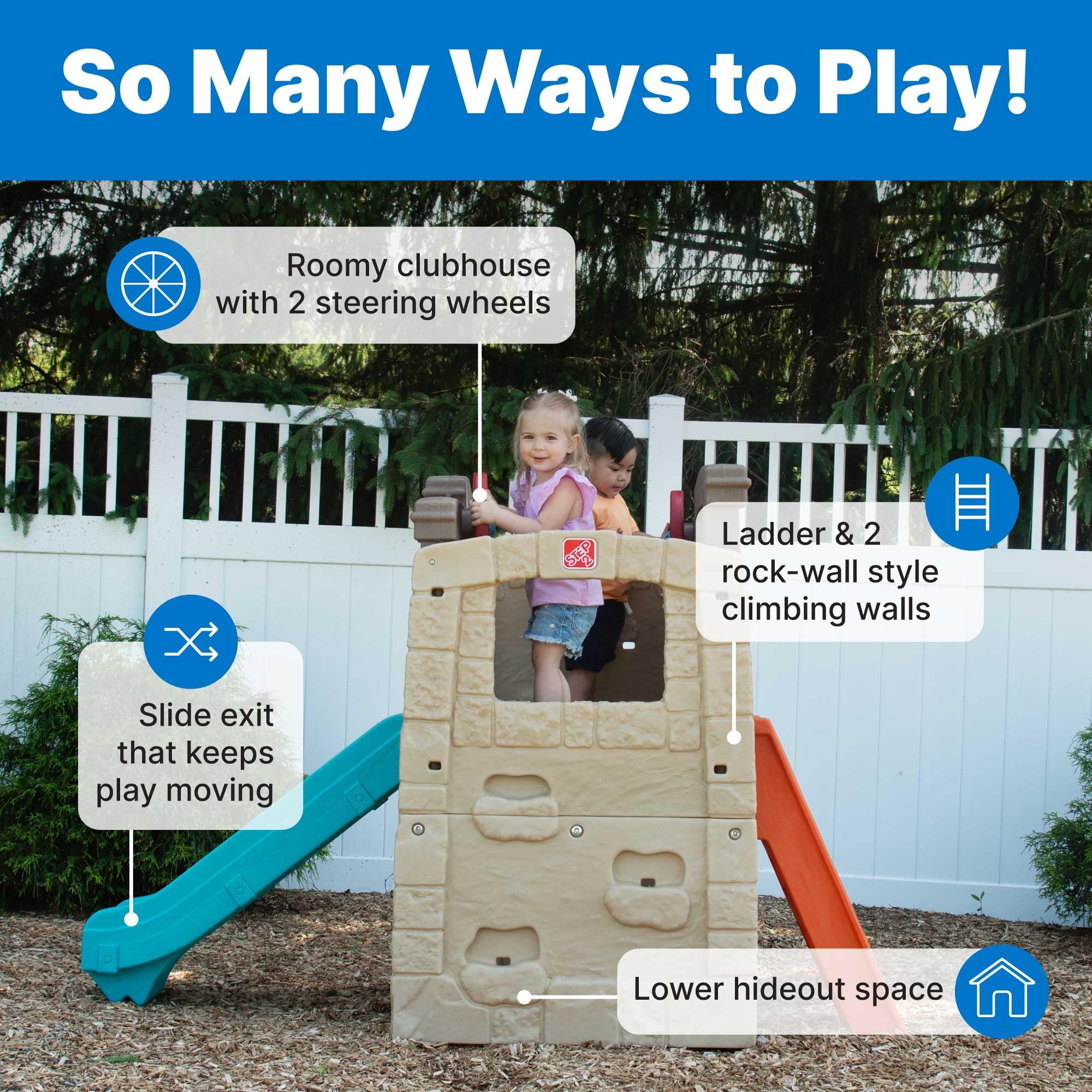 - Park Adventures At Home: Climbing wall, roomy deck, two steering wheels, slide, ladder, and a lower hideout for nonstop backyard fun